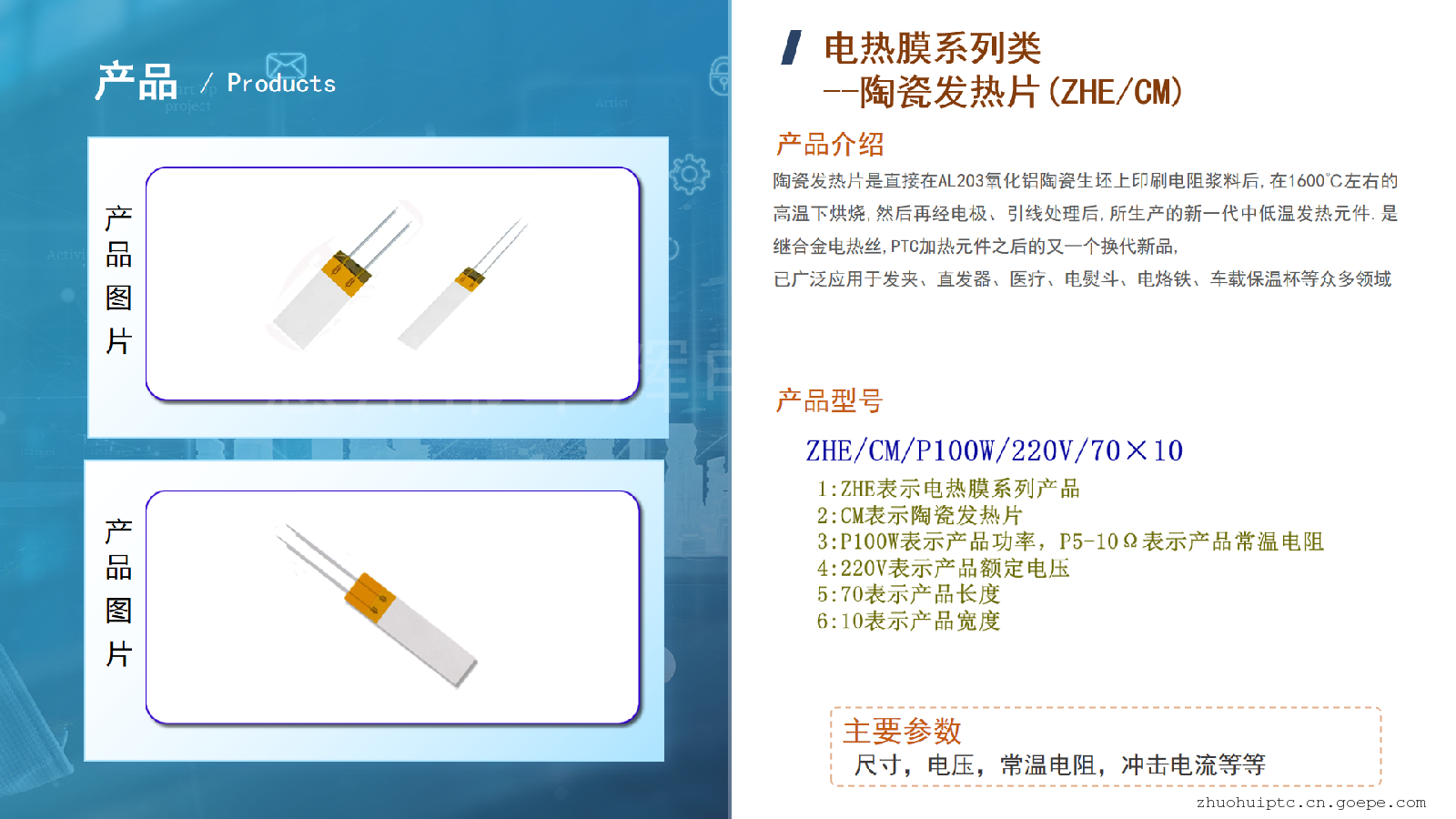 MCH陶瓷发热片:是将厚膜粉料通过设备印刷到陶瓷片里,再经过烧结、包封等技术制备在特制的陶瓷板和陶瓷管上,形成像印刷电路一样的带状导电电阻通道,基本通过电流后发出红外热量和传导方式进行加热。卓辉的陶瓷加热片以其升温快、补偿快,具有前类发热元件无可比拟的优势,它电阻小、功率大、无明火、自身绝缘,安全可靠等特点。 主要应用领域:锔油机、电夹板、卷发器、卷发梳、电吹风、锔油帽、烫发器、直发器、直发梳、离子烫等以及一些需要快速升温及温度要求高的电热产品上。